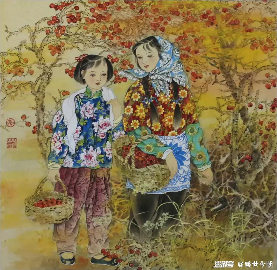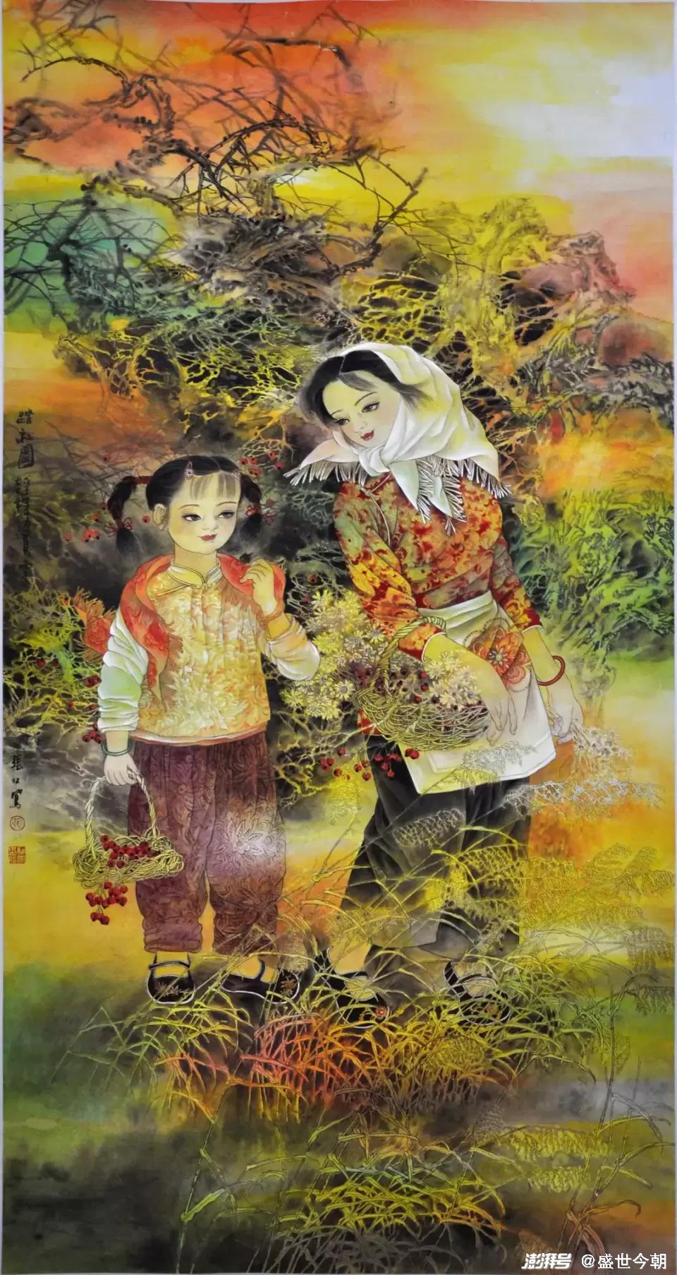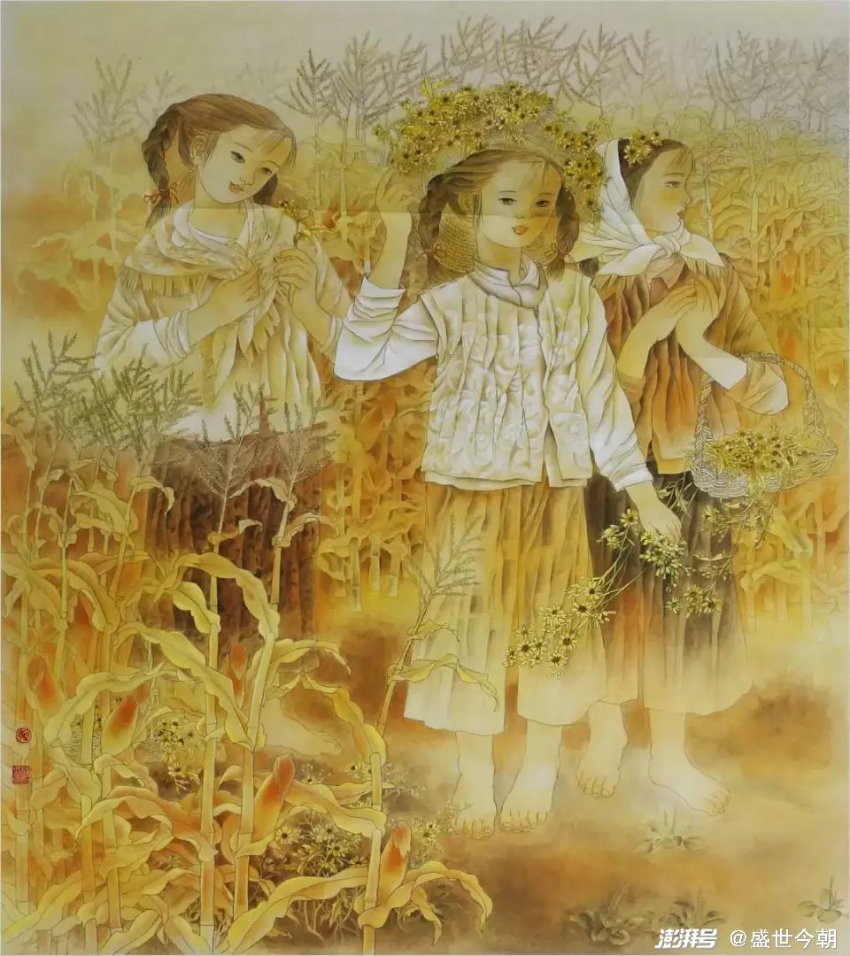 其三,只有艺术的真诚,没有女性艺术家的狭隘。张双凤始终围绕淳朴、单纯、天真、忧郁等元素来建构的审美理想,如《十月香风》《山丫》《秋语》《香风》等作品,偏爱以村姑和孩子的形象植入画面,村姑的质朴善良,略带忧郁的表情,超脱不媚俗的内在气质,代表着一种朴素美丽、原始纯真,孩子则代表着天真无邪、无忧无虑、与世无争和单纯明净。村姑和孩子已经符号化、精神化和象征化了,为人们建构了一个略带忧伤而远离喧嚣与尘俗的世界。这是张双凤站在女性的立场和视角,或之于题材的偏好、情感的侧重点去营构的。一方面时代的变迁,社会急剧变化,给人们带来了深刻影响,而女性对于生存环境、情爱感受有着天然的敏感,有所区别于男性的,但是,张双凤没有仅限于女性的视野和局限性,而是把它上升为时代所普遍缺失的情感诉求,作形而上的传达。从一定意义上而言,作品凝炼出的非凡的叙述、提炼、概括能力,其社会意义是深刻的。