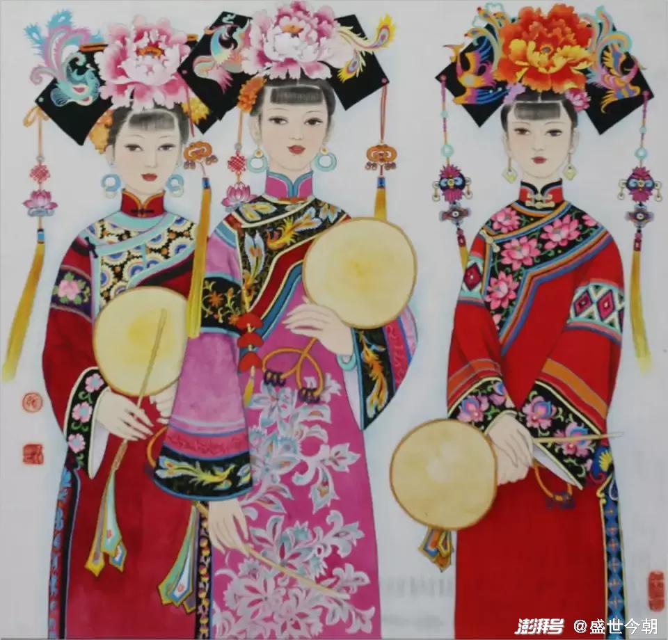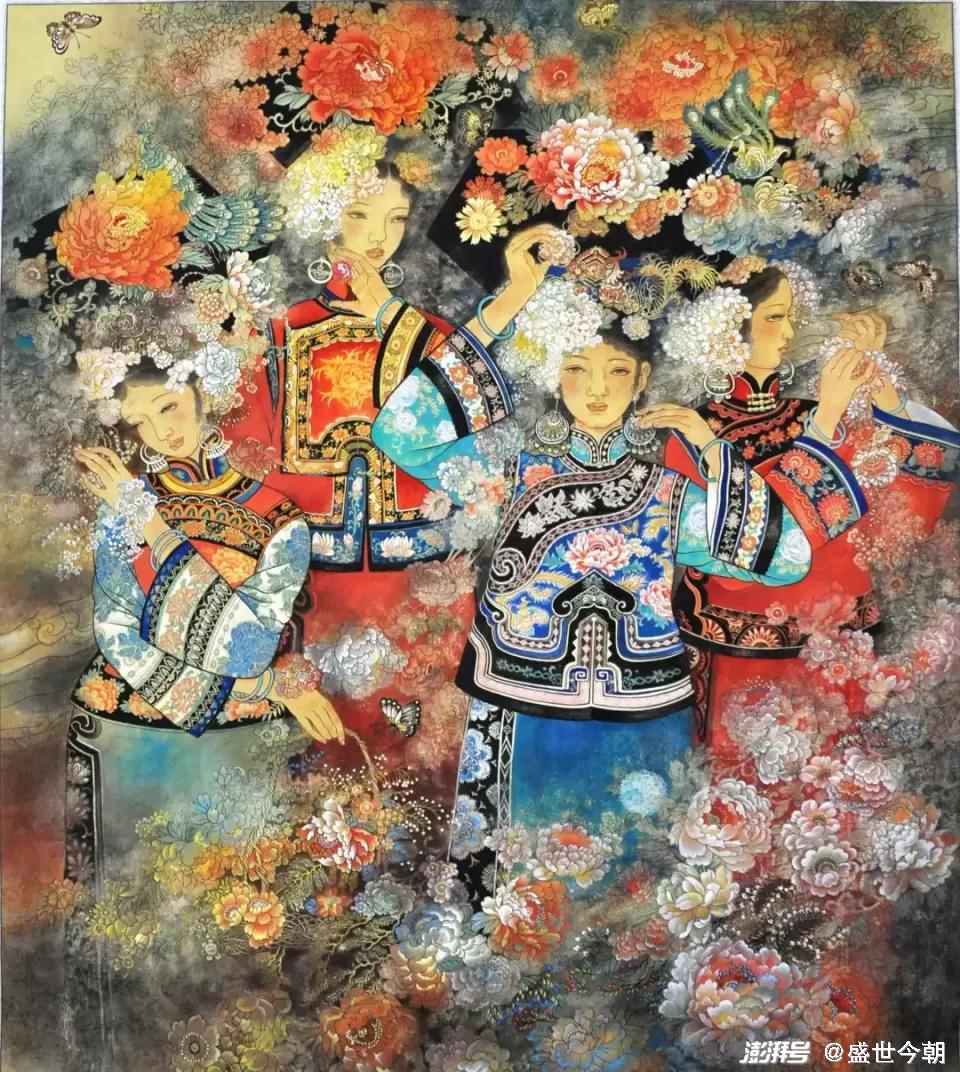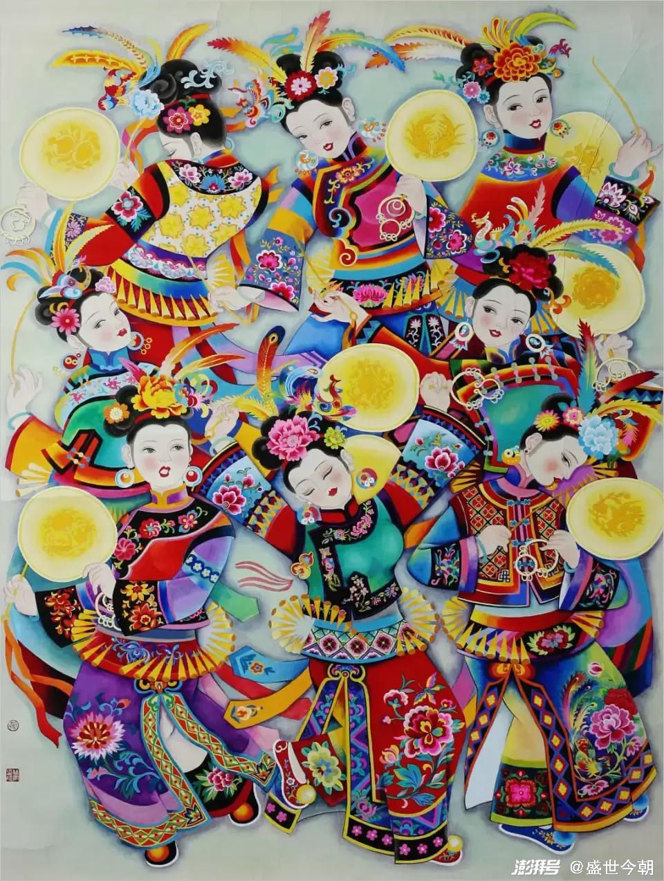 “民族的才是世界的”,每个民族都把自己民族的记忆、历史和情感凝结成一个个图腾,一种审美的符号,化作一种精神和力量传承下去。张双凤就非常注重挖掘和继承传统满族的民间艺术,始终贯穿着用绘画语言去深情地展现满风古韵。张双凤在姥姥的长烟袋、大襟衣服以及动人的农耕渔猎的民间故事与传说的熏陶下长大,自小沐浴在满乡文化童谣、萨满习俗中,所以,她的人物画始终围绕满族的风土人情,民间故事作为自己创作的蓝本,满族的生活、服饰、舞蹈成了张双凤首选的创作素材。有关满族的资料,张双凤悉数收集和查阅,曾多次到新宾、岫岩等满族自治县采风,看那里的歌舞、风俗。张双凤的作品,满族的护膝、靴子、鼓柄、腰铃、民间传说和皇家服饰表现的是那么的真切和自然,作品《关东三大怪》《满乡风情》《盛世太平》《摇篮曲》等,满族的旗袍、坎肩、单鼓舞、木底高桩鞋等服饰造型及各种风俗都得到了淋漓尽致的体现,无不浸润着张双凤对民族、历史和文化的一种“寻根”情怀。《太平馍馍的传说》是根据满族哥俩除去害人猛虎的故事创作的。表现的是身着满族服饰的哥俩带着弓箭骑马奔向森林、村民敲锣打鼓、载歌载舞、包饺子庆贺等场景,缜密的艺术构思和娴熟的技巧,尤其是满族风土人情的真切感的传达令人信服。《迎春》《闹花灯》《夏》《庄户剧团》《硕果累累》《太平馍馍的传说》等构思巧妙,大胆运用想象,形象质朴夸张、构图饱满充实、色彩明快绝俗,具有浓郁的地域特色和浓厚的世俗气息,一扫当下“为形式而形式”僵化刻板的俗套模式,有超然物外之感和脱离尘俗之态。《太平谣》《掐春图》连续斩获辽宁省金奖并入选第10、第11届全国美展,就是张双凤以满族传统舞蹈为素材,凭借细腻传神的笔法,浓烈和谐的色彩,独到的艺术造诣创作的,得到已故省美协主席宋雨桂的大加赞扬,视为“创新、独特”。