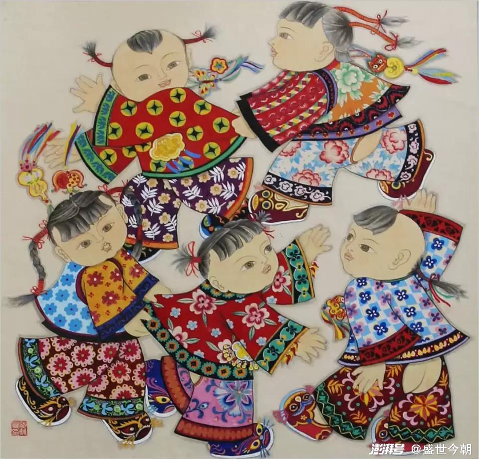 无论稚嫩的孩子和纯朴的村姑、土地、自然、器物,还是表现形式元素,深浅、黑白、繁简、浓艳、光鲜、恬淡等的营构,都是“颂乡野而非都市”,始终如一去表现稚拙、天真、乡野、乡土、乡情,这是张双凤作品外在的显著特征。我想,如果不是大量地分析张双凤的作品,人们不与现实对接,有着透彻的经历和感受,是理不清张双凤所要表达的精神维度和审美理想的。如《晨曦》《山妞》《山里红》《山娃》《村姑》等作品,分明让人们触摸到山坡上的羊儿们,慢悠悠地吃草,无数朵飘动的白云偶尔似乎会驻留,清泉像音符一样欢快地跃动着奔向大海林间那些不知名的鸟儿,此起彼伏地歌唱,山里那个静呦,让人真切地体会到“蝉噪林逾静,鸟鸣山更幽”的境界;在那沟沟叉叉的小河边,大姑娘边说边笑洗着蔬菜,小媳妇背着可爱的宝宝,蹲在河边的石板上用棒槌敲打洗着衣物;孩子们或不知疲倦地互相追赶,或爬上村头的大梨树嬉闹;大树底下公公叼着大烟袋,惬意地冒口小青烟,婆婆一边唠嗑,一边纺线,俏村姑绣着荷包;到了夕阳西下,朵朵白云慢悠悠地消逝,羊群陆续归家,家家户户炊烟袅袅,山里人又静待日复一日忙碌而又充实的一天的开始……这些人间的烟火气,与远远近近时有时无的山歌伴唱,汇成了六甸生活的的底色——真有那种与世无争的感觉!