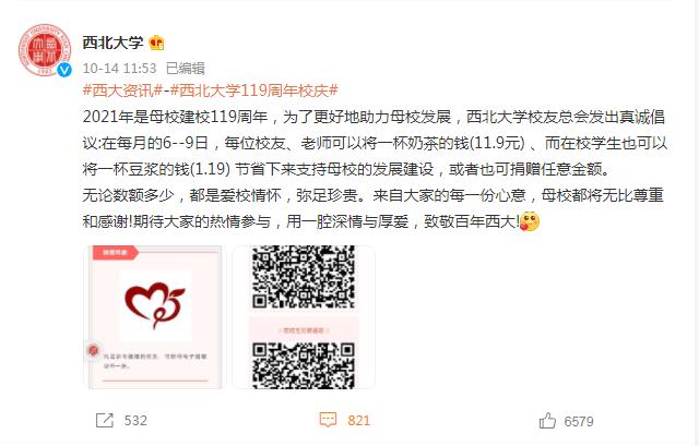 2021年是母校建校119周年,为了更好地助力母校发展,西北大学校友总会发出真诚倡议:在每月的6-9日,每位校友、老师可以将一杯奶茶的钱(11.9元) 、而在校学生也可以将一杯豆浆的钱(1.19元) 节省下来支持母校的发展建设,或者也可捐赠任意金额。无论数额多少,都是爱校情怀,弥足珍贵。