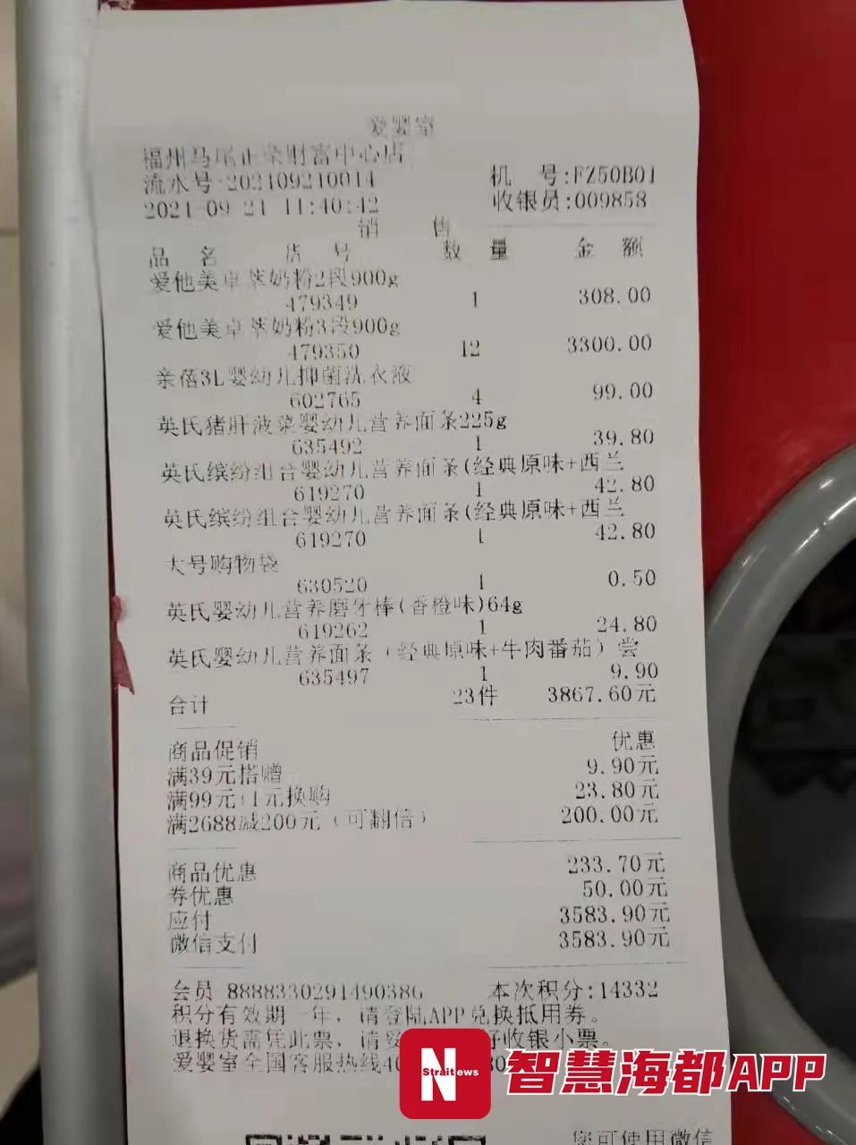 9月21日,马尾正荣财富中心爱婴室正好有促销活动,家住马尾的林先生就购买了一箱爱他美卓萃3段奶粉及其他婴儿用品。