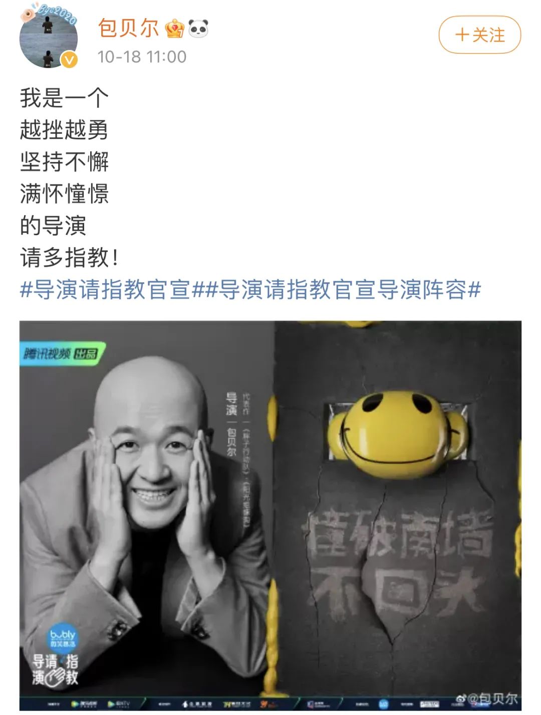 包贝尔从演员跨界导演,执导的电影《胖子行动队》《阳光姐妹淘》等在豆瓣的评分就没有超过5分过,不过他在博文中称自己“越挫越勇”,还表示此次参加节目是想让自己的导演能力被更多的投资人看到。
