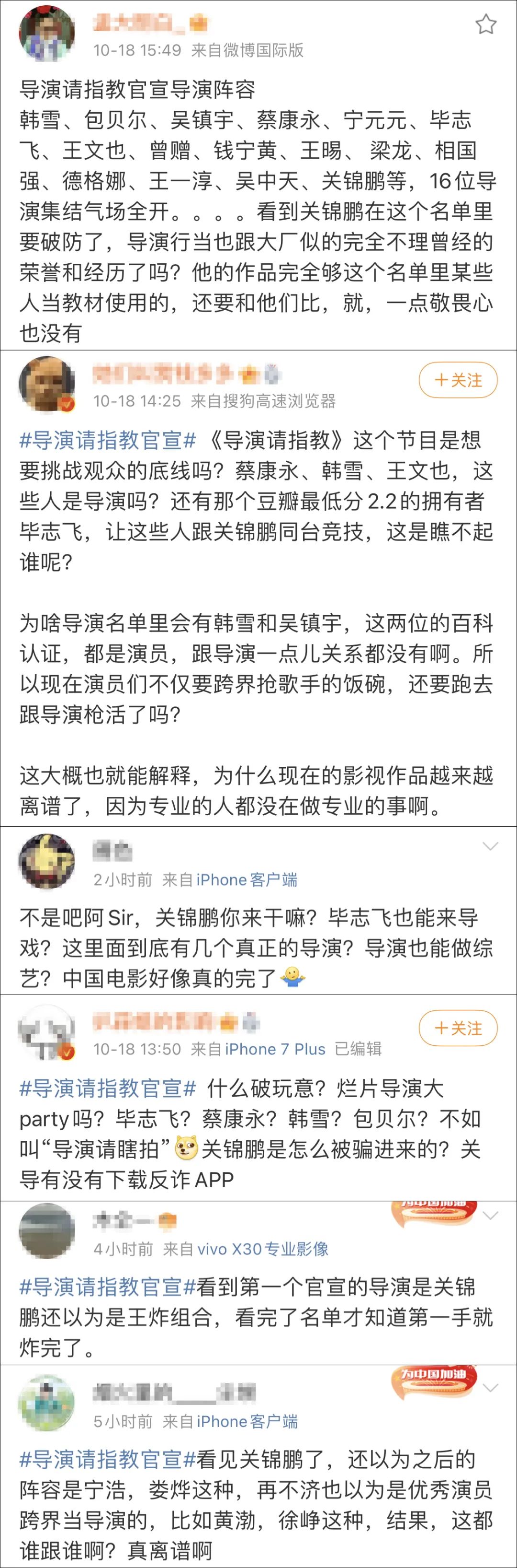 纵观整个阵容,实在是槽多无口:“现在连当导演都没有门槛了吗?简直是挑战观众的底线!”“这是什么,烂片导演大party吗?这几个导演的作品加起来能凑够10分吗?”“本来看到第一个导演是关锦鹏,还以为会是王炸阵容,看完名单才发现早炸完了”……