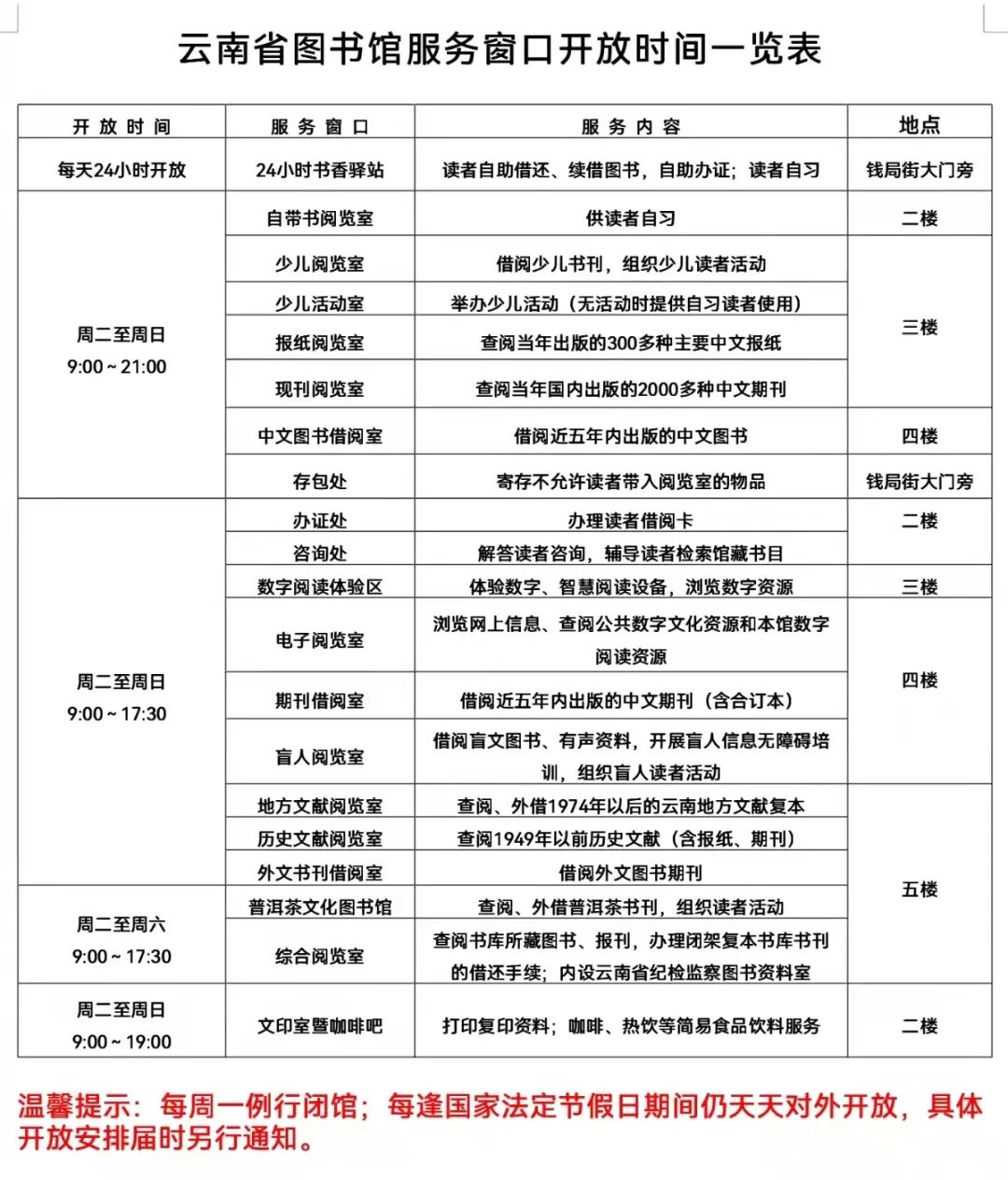 为了保障读者服务工作正常有序运转,确保国有设施设备及管理运行系统安全,按照《中华人民共和国公共文化服务保障法》《中华人民共和国公共图书馆法》,参照国家图书馆和绝大部分省级公共图书馆每周一闭馆一天的通行做法,经向云南省文化和旅游厅报备,云南省图书馆自2021年10月25日起,实行每周一闭馆一天(线上公共文化服务暨数字阅读不关停;“24小时书香驿站”仍为每天24小时开放)。