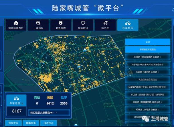在现场巡查之外,执法队注重发挥“智慧城管”科技赋能,一个月前上线上海首个共享单车管理“微平台”,建立共享单车应用场景,将共享单车运营数据真实、完整、准确地接入城管“微平台”,让执法人员能实时掌握数量、点位。现在,微平台已经接入美团、哈啰、青桔等单车运营企业的数据信息。
