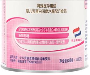 GB 25596—2010《特殊医学用途婴儿配方食品通则》2中定义:特殊医学用途配方食品是指针对患有特殊紊乱、疾病或医疗状况等特殊医学状况婴儿的营养需求而设计制成的粉状或液态配方食品。在医生或临床营养师的指导下,单独食用或与其他食物配合食用时,特殊医学用途婴儿配方食品能量和营养成分能够满足0-6月龄特殊医学状况婴儿的生长发育需求。家长们在挑选牛奶蛋白过敏宝宝的治疗配方时要看清瓶身上的“特殊医学用途婴儿配方食品”字样,并认准注册号。像下图所示,真正的特医奶粉罐子上都会标注以上信息,家长们要擦亮眼睛,选择真正的特医奶粉!