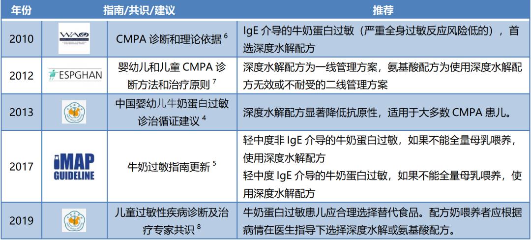 近年来,各个国家的指南共识也对牛奶蛋白过敏临床诊疗使用的配方进行了推荐。