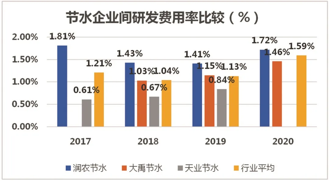 根据新三板智库数据显示,2017-2020年间,润农节水的研发费用率高于同行业A股上市公司的大禹节水,更是远远高于行业平均研发费用率,体现了公司较为注重研发,具备一定的行业影响力与技术竞争力。