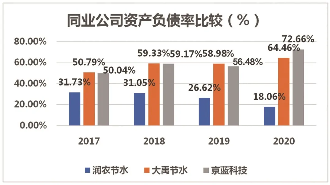 2017-2020年间,大禹节水的资产负债率从50.79%增加到64.46%,京蓝科技的资产负债率从50.04%增加到72.66%。反观润农节水,资产负债率在2017年为31.73%,至2020年已经下降至18.06%,对比上述两家A股上市公司,润农节水的资产状况显现优良。