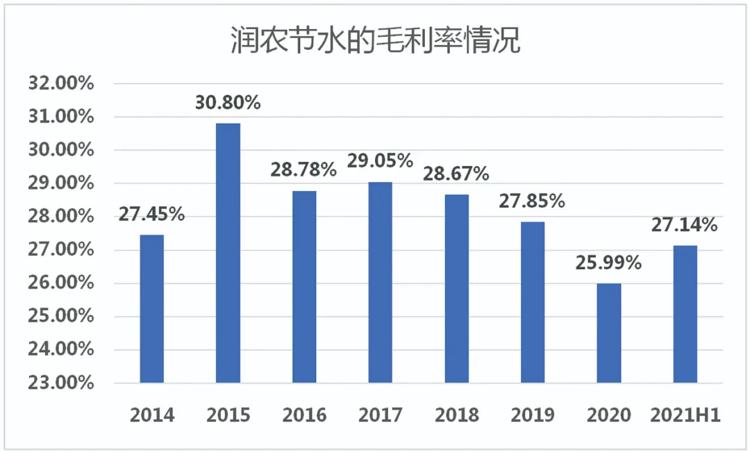 当然也需要注意的一点是,近年来,润农节水毛利率有所波动。2014年至2020年及2021年上半年,该公司实现毛利率分别是27.45%、30.8%、28.78%、29.05%、28.67%、27.85%、25.99%、27.14%。