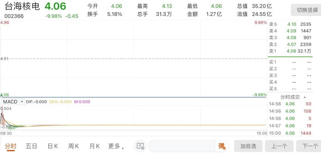 受此消息影响,10月19日,台海核电跌停,报4.06元/股,总市值35.2亿元。