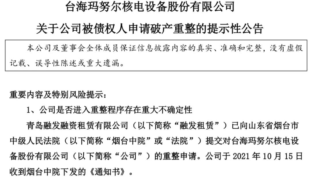 10月18日盘后,台海核电公告,其于10月15日收到烟台中院下发的《通知书》,青岛融发融资租赁有限公司(下称“融发租赁”)已向烟台中院提交对公司的重整申请。
