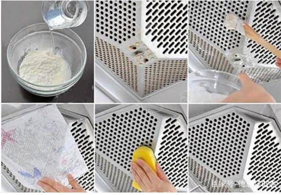 油烟机是厨房的重灾区,就属它最顽固不化。油烟机清洗绝对考验耐心,首先要将油盒取下来,刮掉表面的油渍,在水槽内放入热水,加入小苏打,将油盒浸泡半小时捞出擦洗干净即可。再利用面粉吸油的原理,面粉兑水搅拌成面糊,刷在油烟机上,贴上纸巾,静置10分钟后取下来,用清水擦洗干净即可。在重新将油盒装回去之前,可以在油盒中滴几滴洗洁精,加1/3的水,防止油污黏在内壁上,以便下次更好清洁。