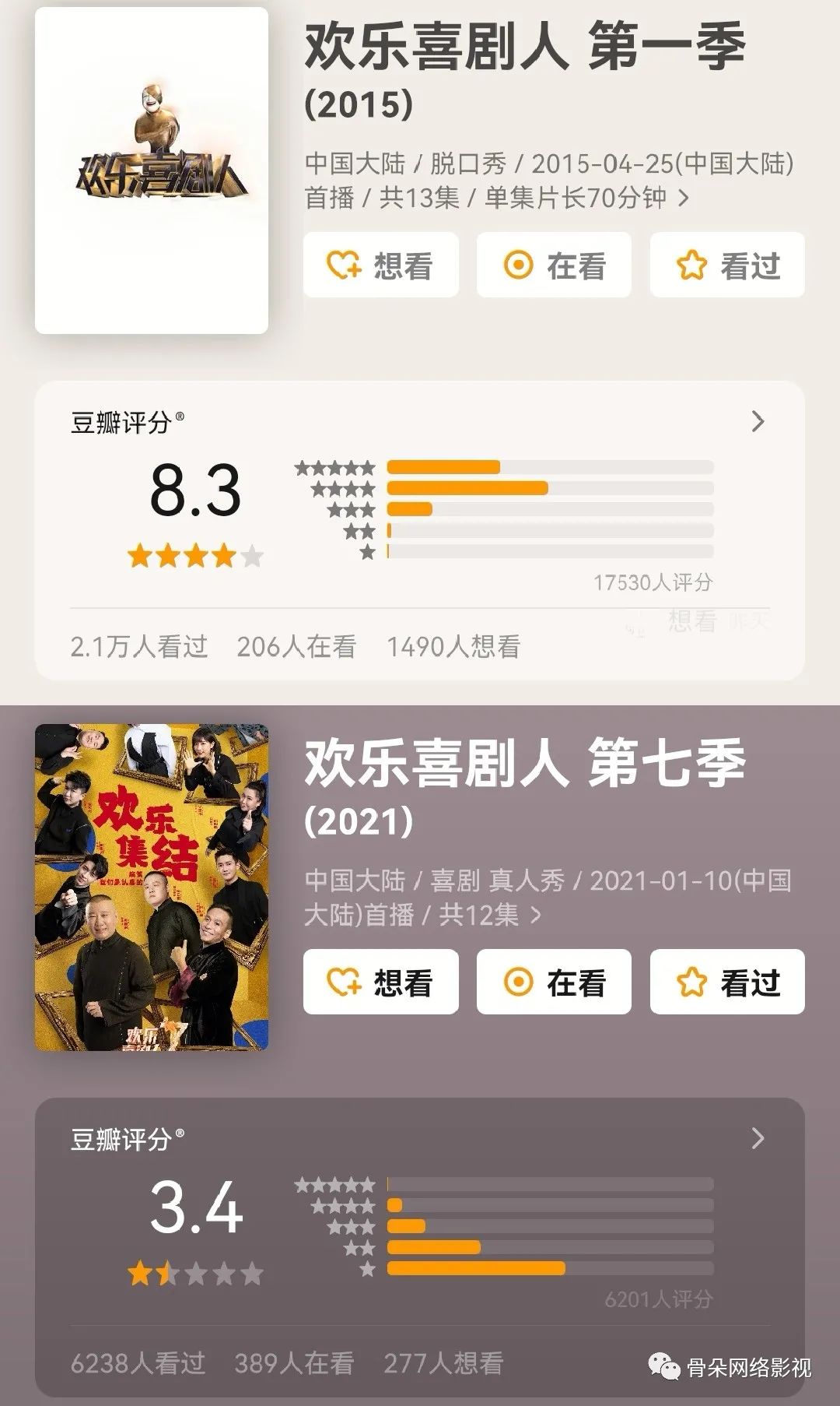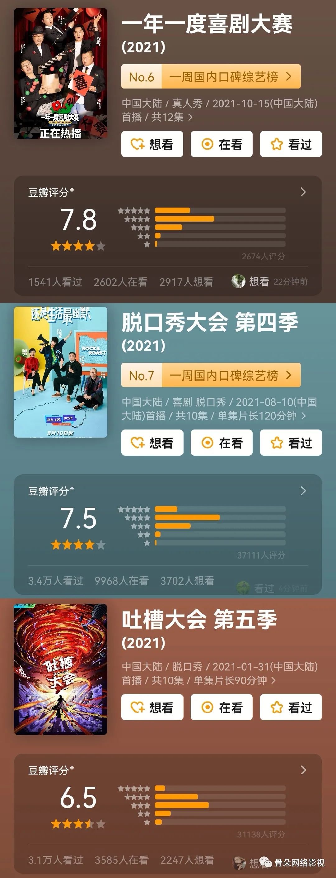根据骨朵数据统计,《一年一度喜剧大赛》在上线次日就冲进骨朵热度指数排行榜前十,豆瓣开分7.9,《脱口秀大会第四季》累计播放量达到14.9亿,收官之后在骨朵热度排行榜中仍然稳居前五,年初的《吐槽大会第五季》累计播放量同样突破11亿,两档节目豆瓣评分分别为7.5分和6.5分,评分人数均超过三万人,实现了热度与口碑的共赢。