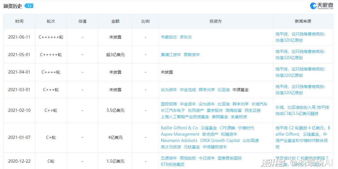 天眼查数据显示,从2020年末到2021年6月,短短半年时间,汽车智能芯片创业公司地平线就完成了7次C轮融资,估值高达50亿美元。“一轮融7次,还能这么玩?”,有网友如此感慨近年来汽车赛道上并不少见的融资奇观。
