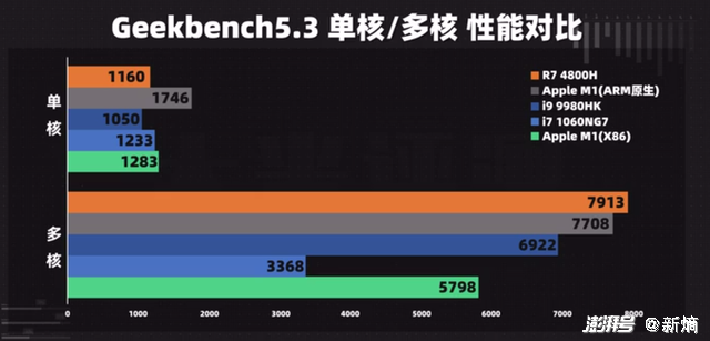 最关键的是,当时的M1芯片性能已十分可人。根据相关行业人员的测试数据可知,M1芯片无论是在单核还是多核性能层面,相较于传统X86架构笔记本差距并不大。在单核性能方面更是远远领先一众包括去年的R7-4800H和i9-9980HK等桌面级处理器。