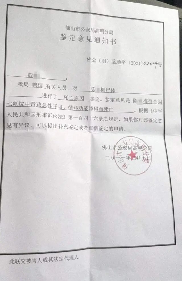 2月2日,警方对“彭某过失致人死亡案”立案侦查,并将彭某抓获。2月8日,警方向家属出具了陈某梅的尸检鉴定意见通知书。