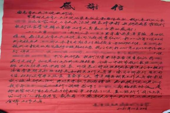 10月20日上午,叶某某的儿媳将一封写满红纸的感谢信和一面鎏金大字的锦旗送到无为法院执行局,对无为法院执行局及执行法官的尽责担当和敬业付出表示诚挚的谢意。