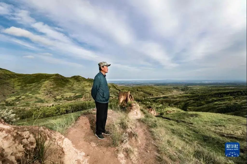 张连印在山西大同左云县摩天岭土长城眺望苗圃、山林。(新华社发 丁美宁6月13日摄)