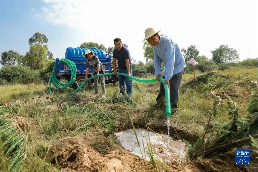 张连印(右)与老伴王秀兰、儿子张晓斌在山西大同左云县张家场乡北梁山坡一起浇水。(新华社发 丁美宁8月16日摄)