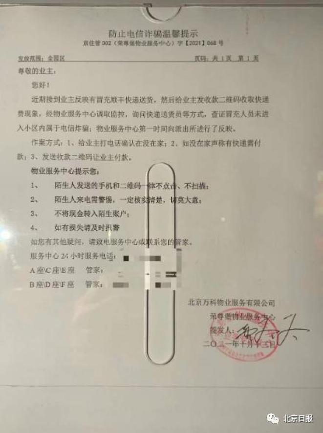 “近期,接到业主反映有冒充快递送货,然后给业主发收款二维码收取快递费的现象,我们调取了监控、询问了快递送货员,查证冒充人员并未进入小区内,而是采取了电信诈骗的方式,他的作案手段就是先给业主打电话确认业主没在家,然后声称有到付快递,发送收款二维码让业主付款。我们已经第一时间向派出所报了警,并且在业主群和各楼门的公告栏发布了提醒。”荣尊堡物业项目经理董冬冬说。