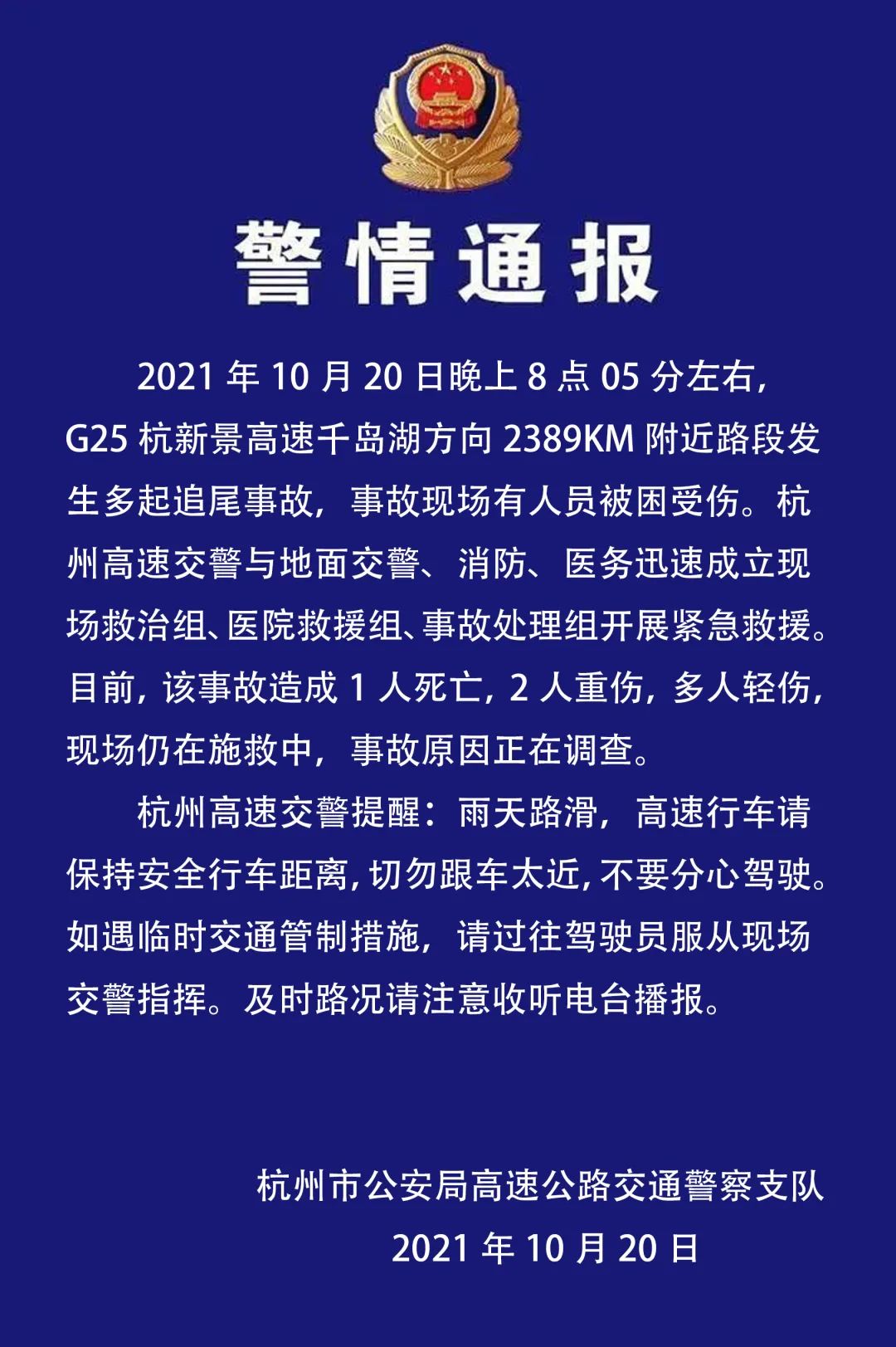21日凌晨0时25分左右,杭州市公安局高速公路交通警察支队发布警情通报:2021年10月20日晚上8时05分左右,G25杭新景高速千岛湖方向2389千米附近路段发生多起追尾事故,事故现场有人员被困受伤。杭州高速交警与地面交警、消防、医务迅速成立现场救治组、医院救援组、事故处理组开展紧急救援。