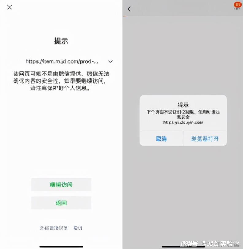 在工信部“互联互通”指导会议之后,微信率先做出了反应,在一对一聊天界面中开放淘宝、抖音等网址链接,但打开时需要经过二次安全确认,相当于增加了多一次的跳转。