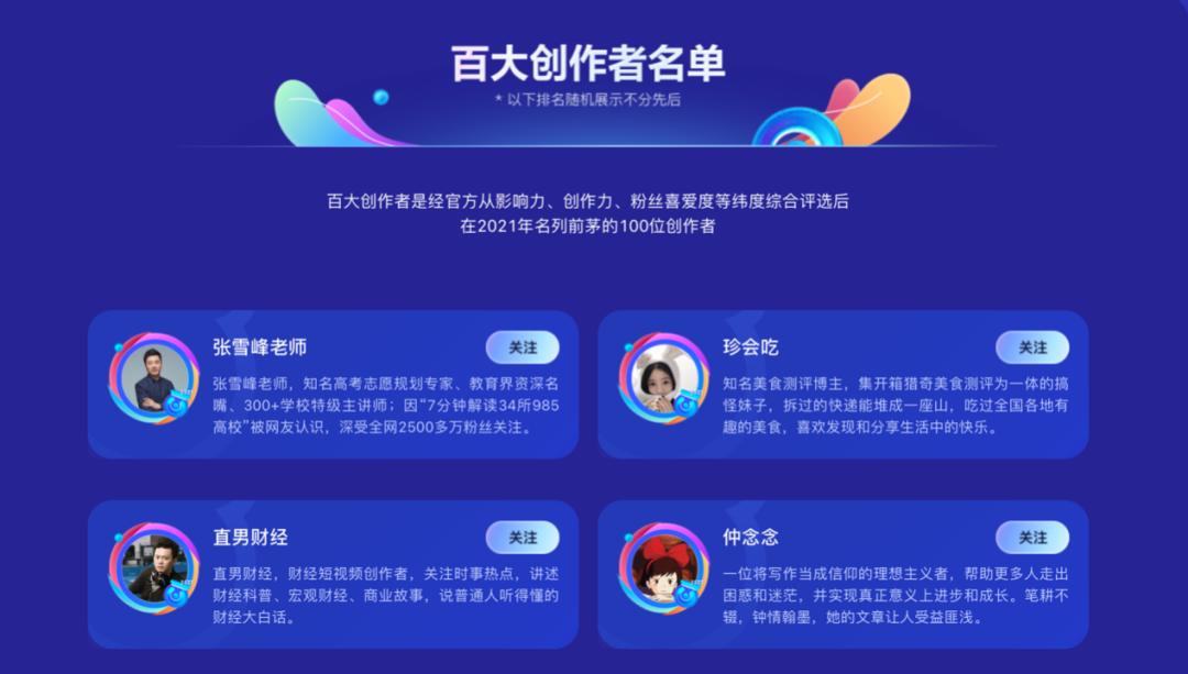 百家号内容创作平台一端连着内容的生产者、创作者,一端连着内容的消费者、读者用户。创作者作为满足用户内容需求的主体,对平台而言意义重大,而平台上最具代表性的创作者,则反映了平台的价值。