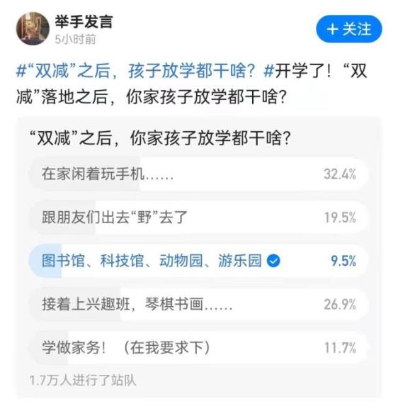 前几天, 腾讯做了一项关于“双减之后,孩子们放学都干啥”的调查,在接近2万人参与的投票中, “在家闲着玩手机”的人数比例高达32.4%。