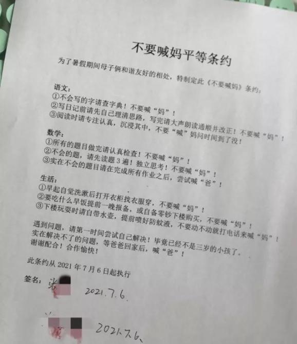在条约正式实施后,孩子果然喊妈的次数少了很多,习惯了自己起床洗漱,给自己盛饭,下楼玩的时候会记得背着水壶和防蚊液。