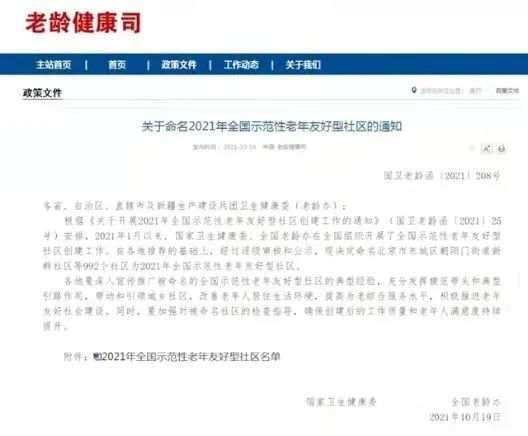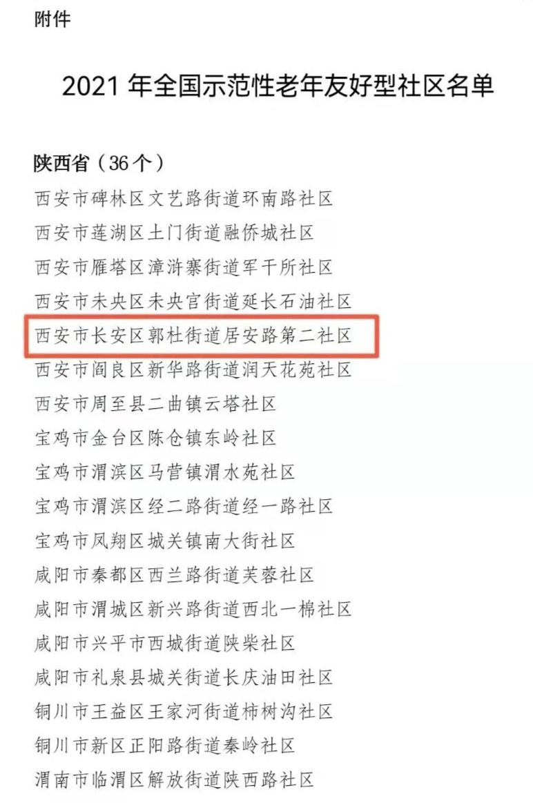 日前,国家卫生健康委、全国老龄办命名了992个社区为2021年全国示范性老年友好型社区,长安区郭杜街道居安路第二社区被命名为全国示范性老年友好型社区。