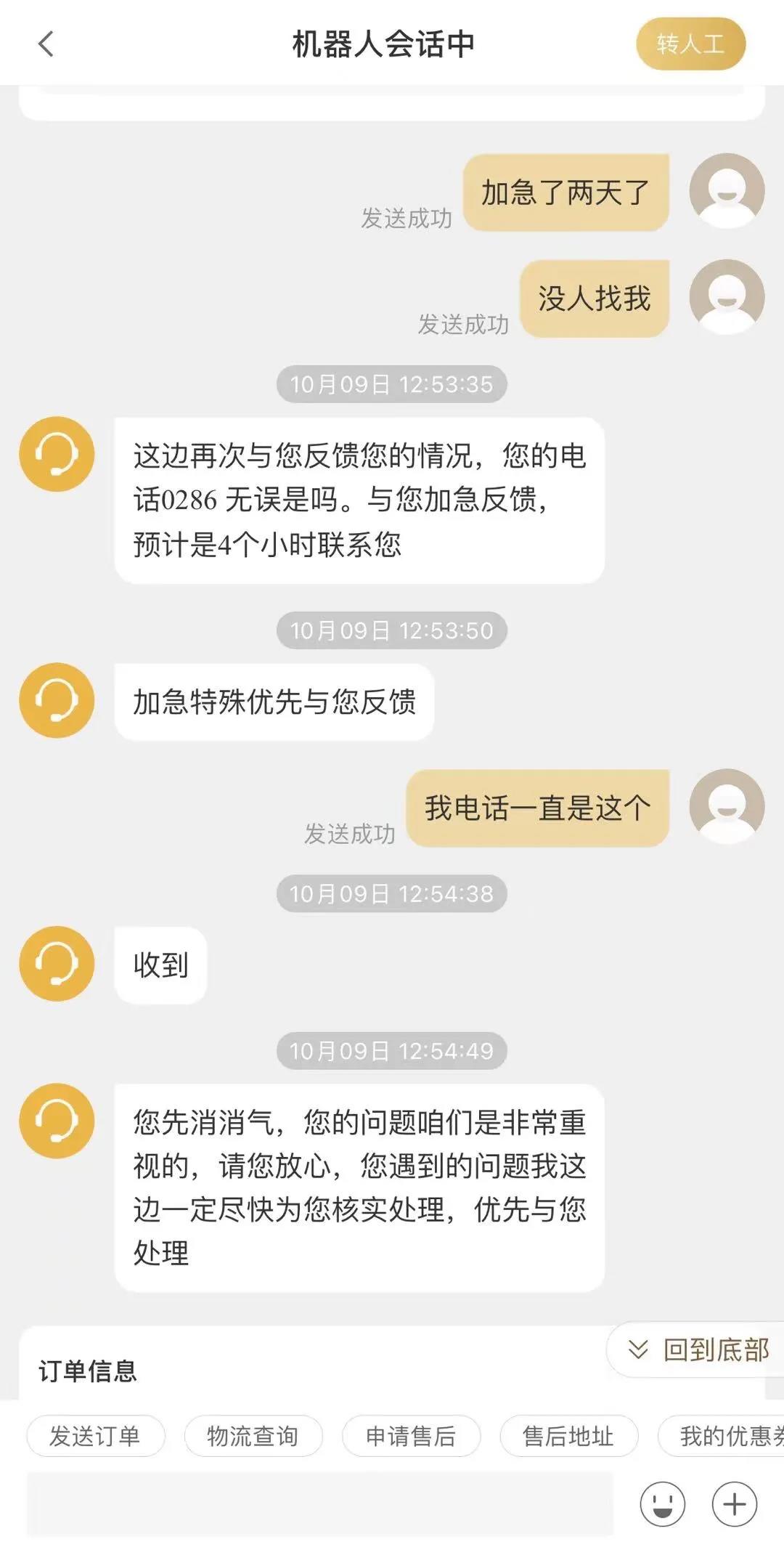后续的售后服务让赵梦佳也颇为生气。“我去申请退货,但是客服说得让维修师傅上门鉴定。我等了整个十一假期也没有收到师傅的信息,直到假期结束,师傅才上门检查,表示压缩机不制冷,无法维修,建议我们退货。但是最后开的却是一个换货单子,而且是过了4天才出来。”