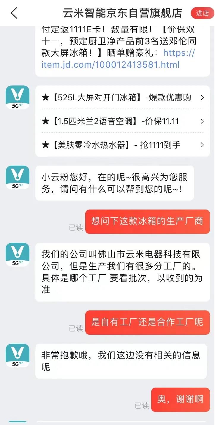 《国际金融报》记者以消费者的身份在电商平台询问在线客服关于云米冰箱具体的生产厂商信息,得到的回复是其有很多分工厂,具体哪个工厂生产,需要看产品批次。当继续询问这些工厂是自有还是合作的第三方,客服并未给出回答,表示没有相关信息。记者在电商平台查询到一款云米冰箱的生产企业基本信息组织名称为合肥雪祺电气有限公司。