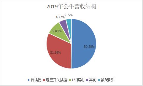 2020年公牛财报统计口径略有调整,调整后公司分为电连接、智能电工照明、数码配件三大业务板块,电连接产品主要为转换器,智能电工照明产品主要包括墙壁开关插座、LED照明、断路器、生活电器、智能门锁等产品,数码配件主要为数码配件类产品。