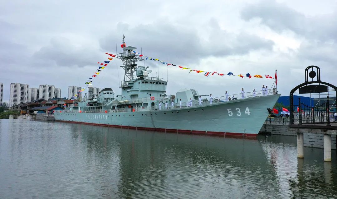 “金华舰”舰舷号534,是我国自主生产的导弹护卫舰,长103.2米,宽10.8米,于1983年服役,2019年退役。在服役的36年中,“金华舰”主要担负近海海域的战备巡逻和护渔、护航等任务,总航时约16000小时,总航程约25万海里,出色完成了战备执勤等各项重要任务。退役后,由部队移交金华市人民政府,用于开展爱国主义教育。