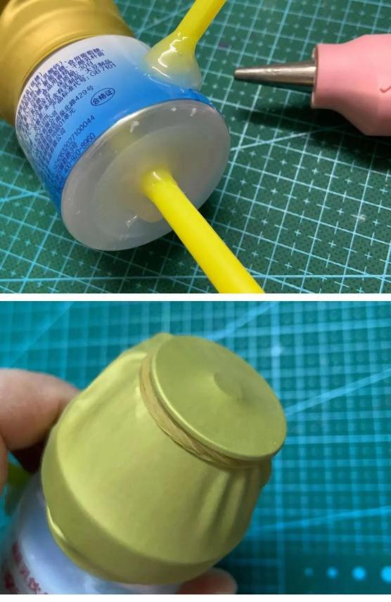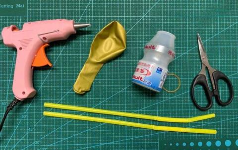 将2支吸管分别从瓶子的侧面和底部插入,注意底部的吸管插入后要接触到气球皮。随后用热熔胶填补吸管与瓶子间的空隙。这样就完成了空气大喇叭的制作。