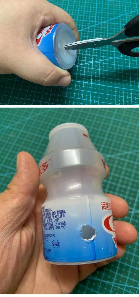 用剪刀在养乐多瓶子的底部和侧面的中下部位置,分别挖一个直径为0.5~1厘米的小洞(使用剪刀时须注意安全)。