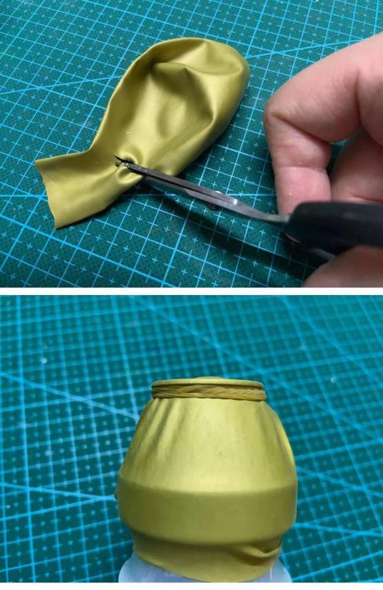 剪开气球,将气球皮翻开后套在养乐多的瓶口处,紧绷气球皮并用橡皮筋绑住固定。
