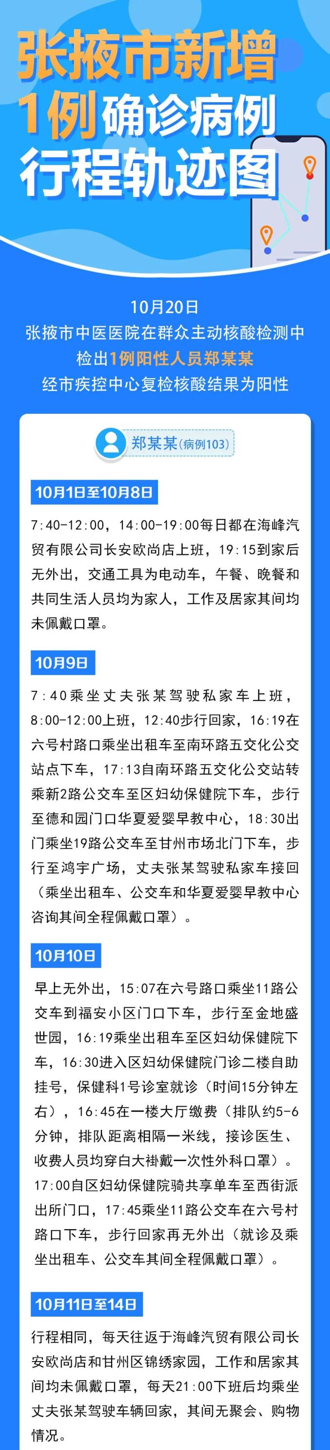10月20日,张掖市中医医院在群众主动核酸检测中,检出1例阳性人员郑某某,经市疾控中心复检核酸结果为阳性。市、区迅速启动应急预案,立即安全转运至定点救治医院甘州区人民医院隔离病房,疫情防控应急队伍迅速对张掖市中医医院、郑某某家中、海峰汽车贸易有限公司长安欧尚店等场所开展流行病学调查处置。经市区两级专家组会诊,确定为新冠肺炎病例(普通型)。现将有关情况通告如下: