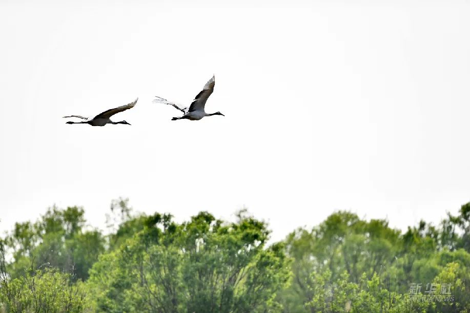 两只丹顶鹤飞翔在自然保护区上空(2021年5月13日摄)。图片来源:新华网