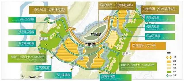 根据规划,作为重庆中心城区城市新名片之一和东部生态城的核心引领区,广阳湾智创生态城将紧扣“长江风景眼、重庆生态岛、智创生态城”战略定位,“两点”承载地、“两地”展示地、“两高”体验地功能定位,在严格保护“一岛一心两屏多廊”生态空间格局的基础上,规划构建“一岛一湾、三城一镇、两屏村居、九廊交织”城野互融共生、“城、镇、村”融合发展的城乡空间格局,描绘现代版巴渝“富春山居图”。