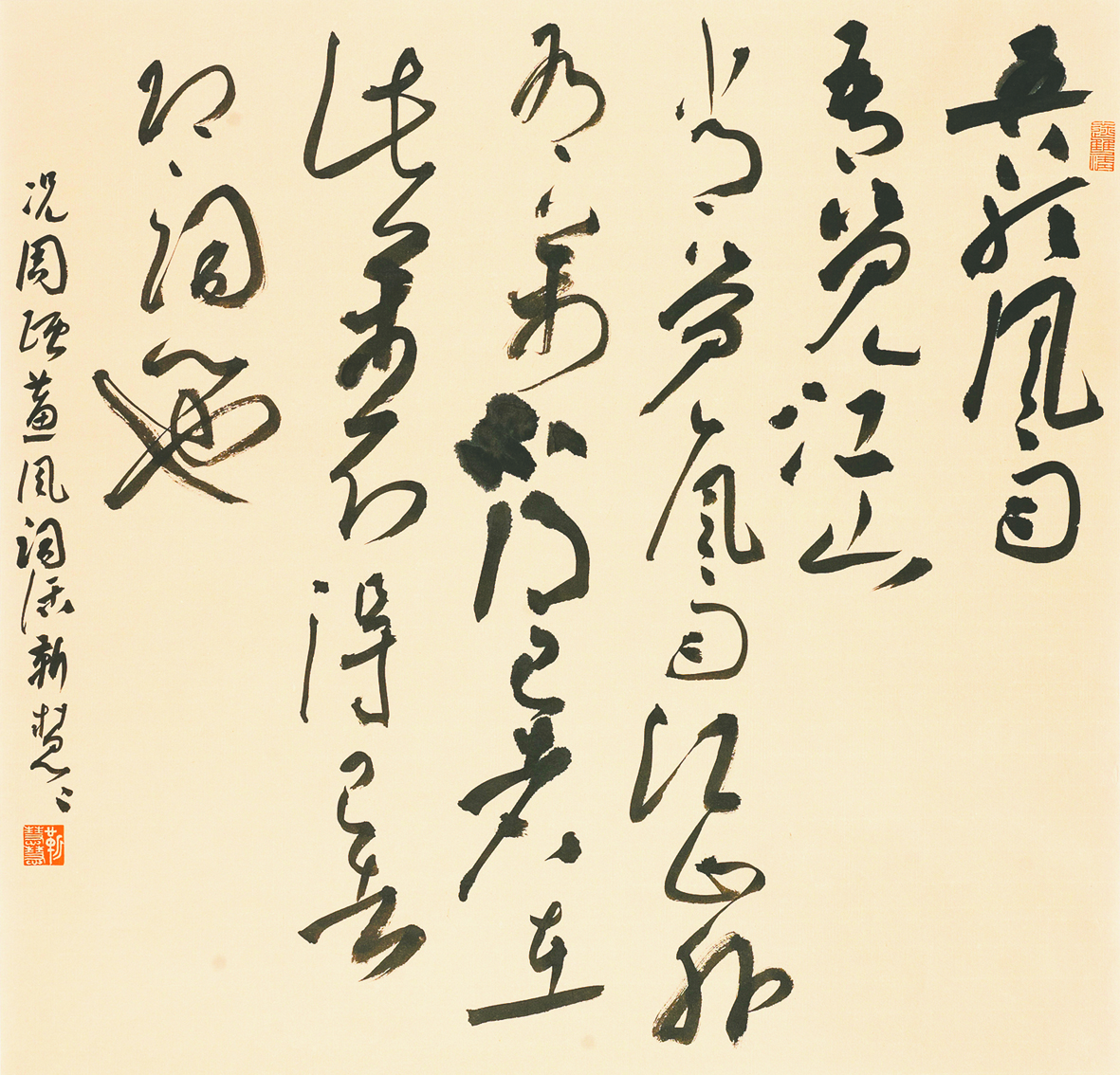 书法的创作仅仅是一个使用毛笔的问题吗?书法关乎脑,关乎手,关乎笔,脑强调的是认知,手强调的是节奏和把控能力,笔强调的是笔法,书法形态的问题。显然,谈书法创作仅仅谈论用笔的问题,是偏执的。一般讲用笔,大家常识中认为只有中锋和侧锋,问题是除了中锋和侧锋还有其他。米芾是古代用笔的高手,他强调八面出锋,所谓的八面出锋,其实是出入自如,无所遮拦,无往而不胜。所以,在临摹时一定要讲求笔法,临摹的核心问题就是要解决笔法的问题,笔法就是古法,它是中国千年书法的命脉。因此,我在临摹的时候,重古人之神,高于古人之形。重笔法高于重字法。“取古人用意而古法俱在”是我坚持的临摹和创作原则,我个人认为,只有这样,自己创作的书法,才能有古人的身影在,也就形成了自我的面貌。