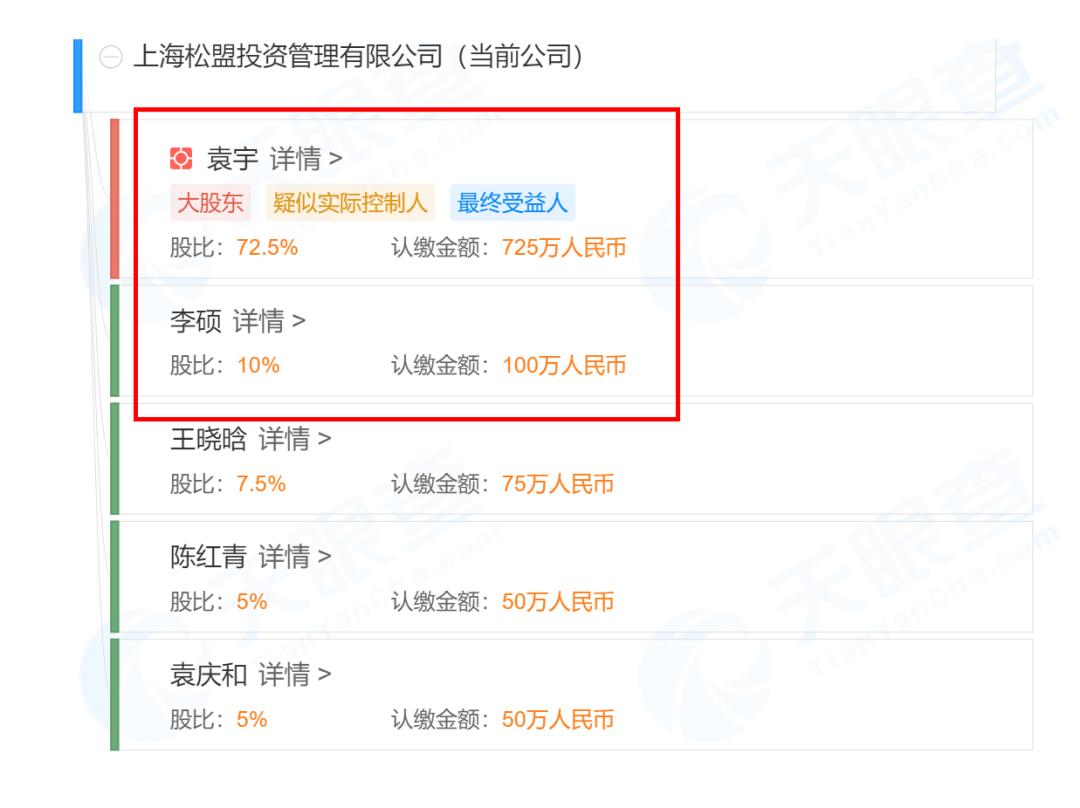 股权穿透后,袁宇持有上海松盟72.5%的股份,而李硕仅持有上海松盟10%的股份,也就是说袁宇“收复"了鸣石投资的控股权。