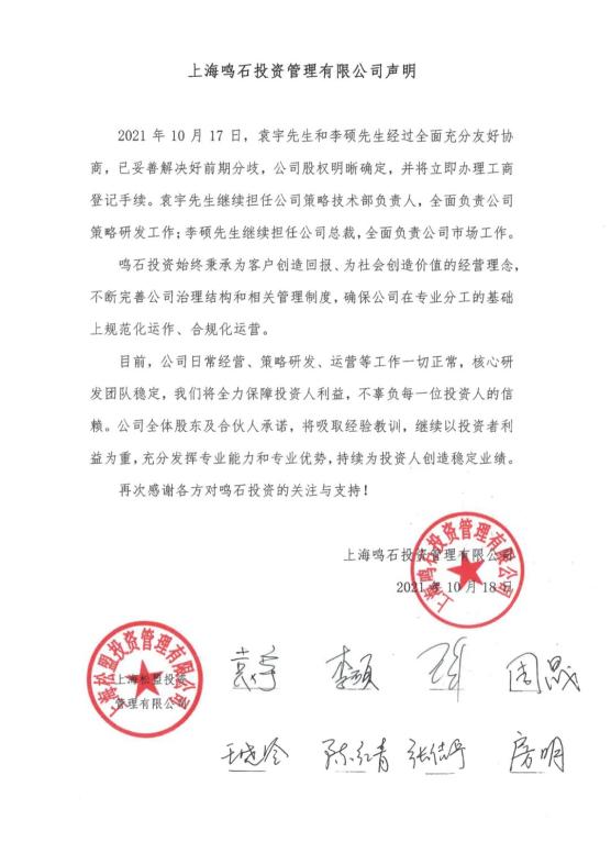 10月18日零点左右,鸣石投资发布最新声明,称,2021年10月17日,袁宇和李硕经过全面充分友好协商,已妥善解决好前期分歧,公司股权明晰确定,并将立即办理工商登记手续。