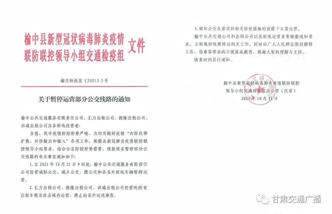 当前,兰州市疫情防控形势严峻,为切实做好疫情“内防反弹扩散,外防输出和输入”各项工作,全力配合做好新型冠状病毒感染的肺炎疫情防控工作,自2021年10月21日12:00起,兰州榆中公共交通服务有限责任公司城际公交(K901、901、K902、903、905、906、907路)及城乡公交(含921路、922路、924路、微公交、乡镇线路)等线路车辆暂时停运,具体恢复运营时间另行通知。