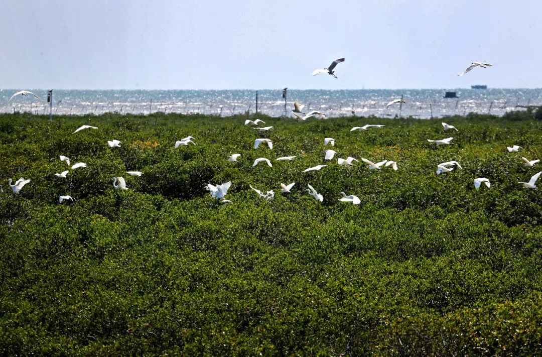 ▲10月4日,在钦州市钦南区犀牛脚镇,成群的白鹭和各种海鸟在红树林滩涂觅食,构成一幅美丽的海滨乡村画卷。广西日报记者 周军 摄