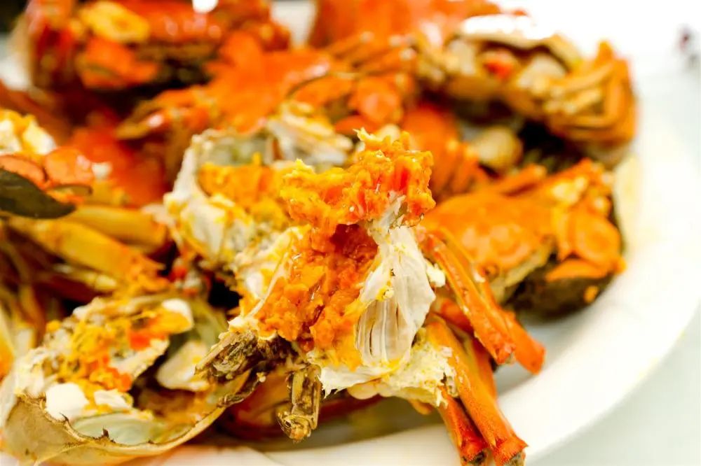 在大闸蟹开捕现场,刚刚捕捞上来的大闸蟹在塘边直接蒸熟,打开蟹壳,深红色膏黄相间,油亮剔透,热乎乎地冒着香气。