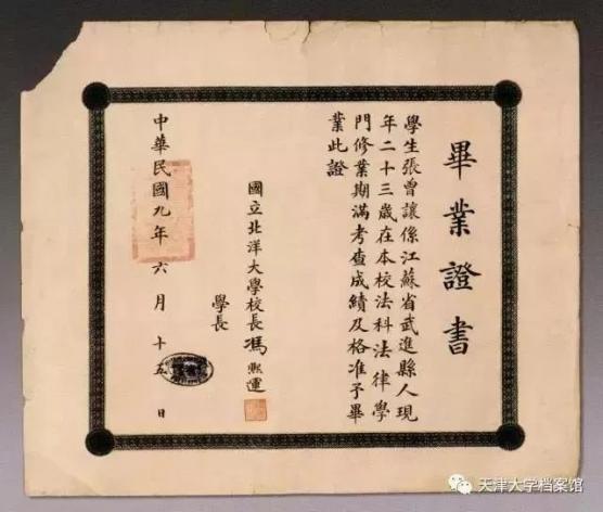 张太雷毕业证书(原件藏于天津大学档案馆)
