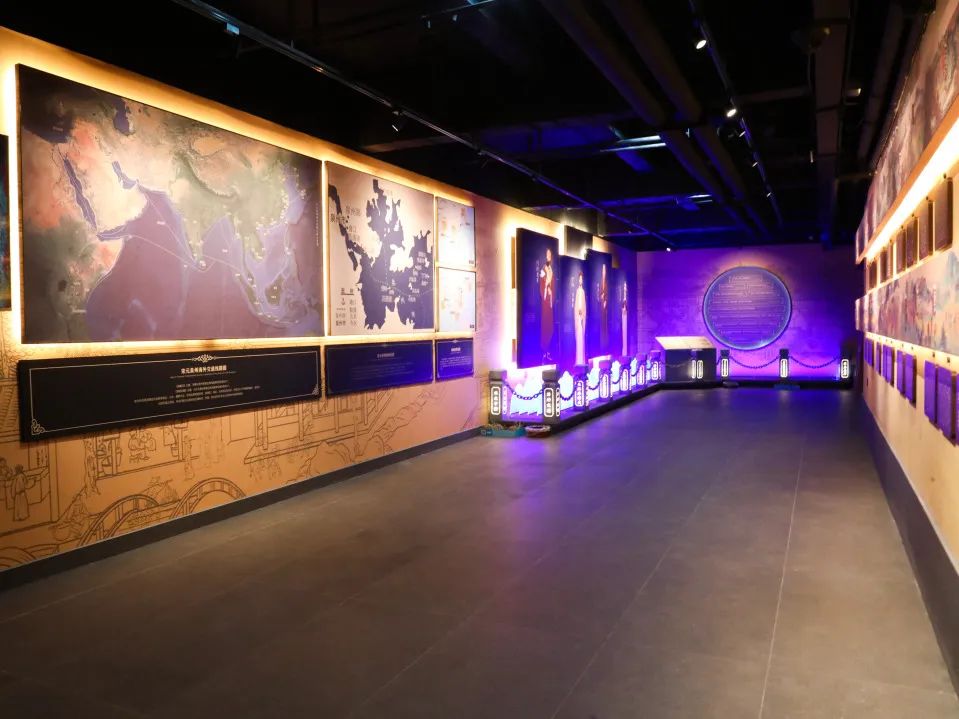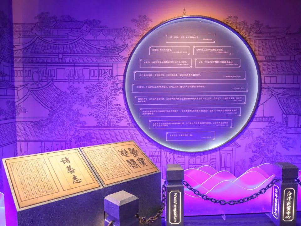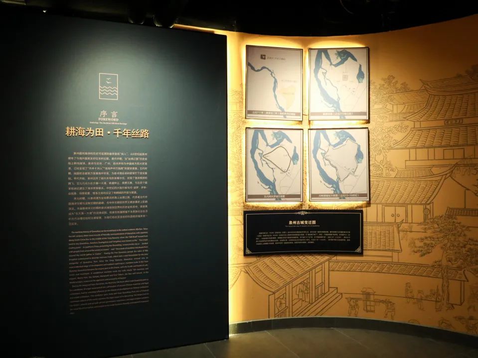 宋元时期,以泉州港为坐标原点的海上丝绸之路,在中华文明和世界文明发展史上影响深远。缓步序厅,您将看到一幅幅地图勾勒出千百年前泉州港的恢弘面貌:泉州海外交通线路地图、泉州港季风图、地形图、古城变迁图等几张大地图将宋元时期的泉州港放到世界的历史坐标系中,通过中世纪四大旅行家的口述和当代中外学者对刺桐城的评价,跨时空呼应着向游客展示了宋元泉州港的繁盛景象。