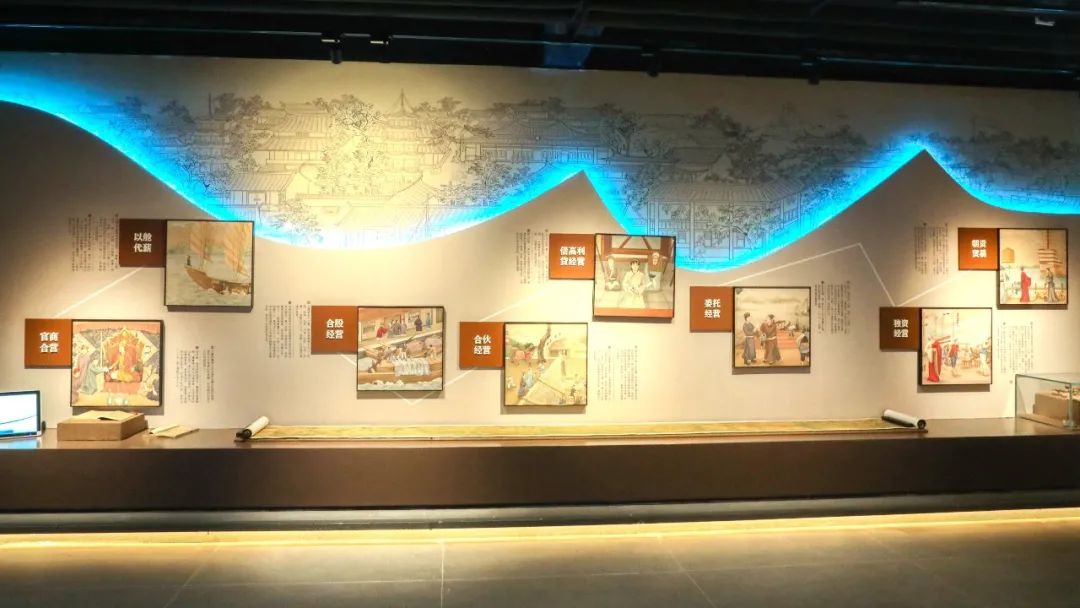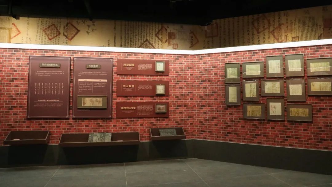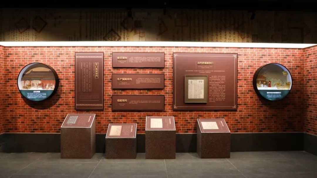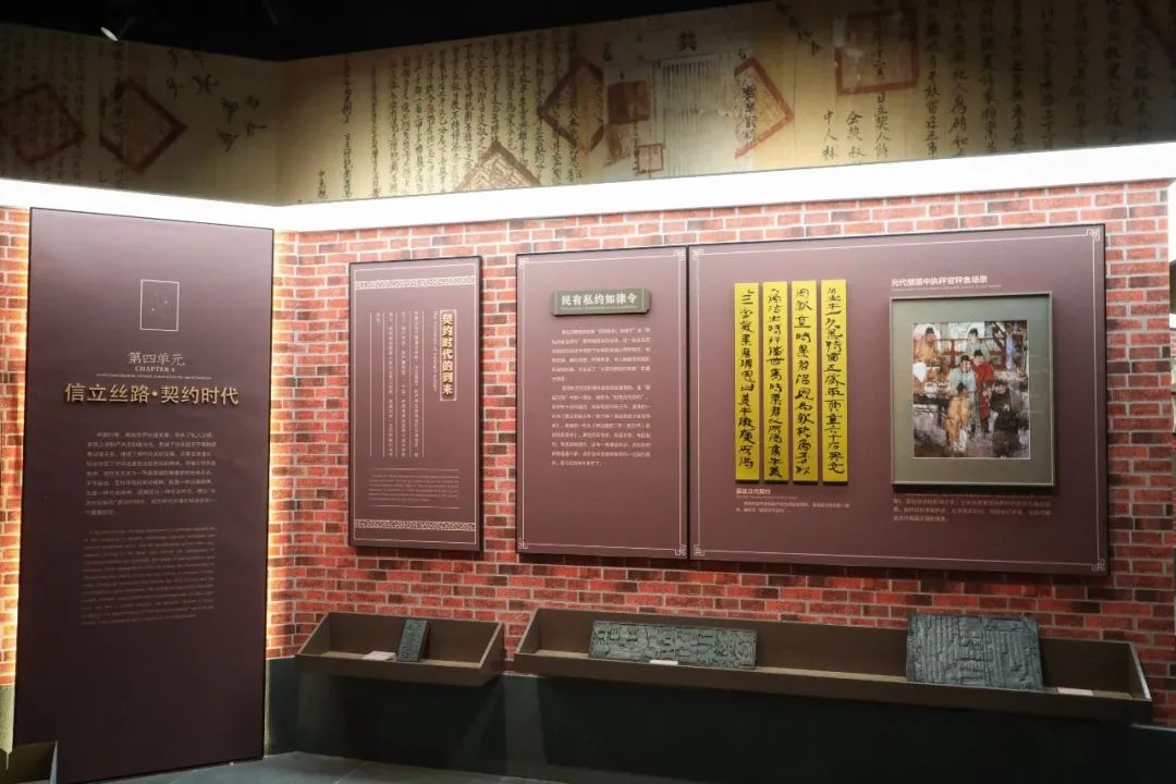 在海上对外贸易中,契约关系成为一种最普遍和最重要的社会关系,平等自由、互利守信的契约精神,既是一种法律精神,也是一种文化精神,逐渐成为一种社会共识。继续移步,便踏入了古香古色的契约单元。这个空间典雅和谐,整洁大气,棕红色的背景营造了庄重古朴的书卷氛围。环顾一圈,会看到用契约图片做成的灯箱环绕在上,大大小小的纸质契约和清代各样式的契约印版做为本区展品非常吸引人们的目光。